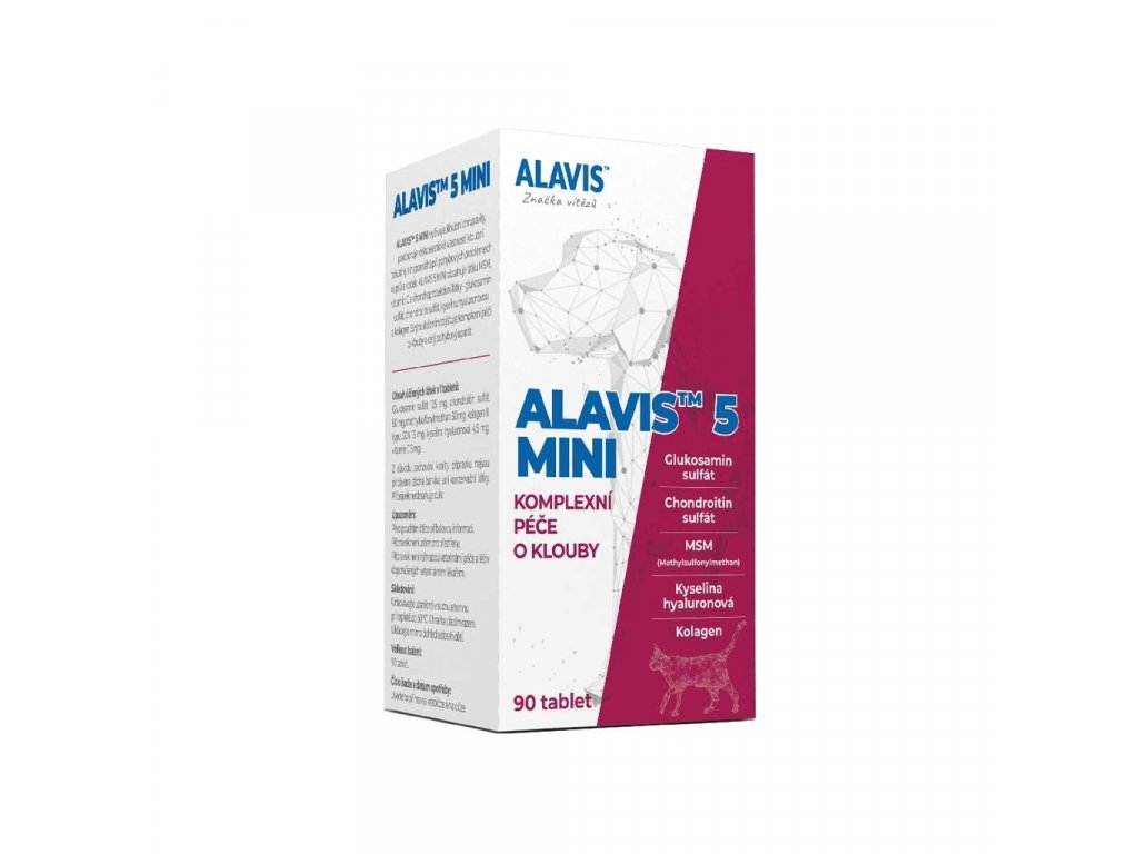 ALAVIS 5 MINI obsahuje Glukosamin sulfát, Chondroitin sulfát, MSM (Methylsulfonylmethan), Kolagen II. typu, Kyselinu hyaluronovou a vitamin C.