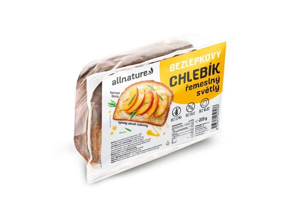 Allnature Bezlepkový kynutý chléb řemeslný světlý je speciálně určen pro osoby dodržující bezlepkovou dietu nebo pro ty, kteří se snaží lepek ve své stravě omezit. Bezlepkové pečivo je navíc i bez sóji a vajec. Má příjemnou smetanovou chuť. Chléb je skvělý s máslem a sladkými polevami. Má vysoký obsah vlákniny, nezbytný pro bezlepkovou dietu. Pečivo je ideální na toasty.