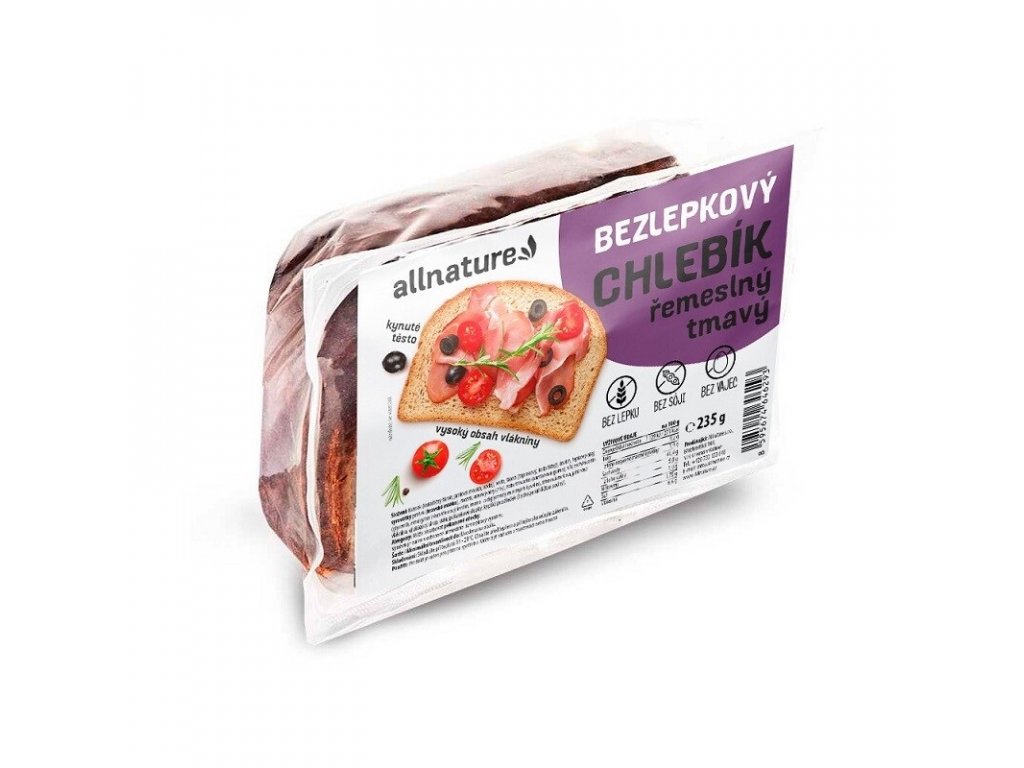 Allnature Bezlepkový kynutý chléb řemeslný tmavý je speciálně určen pro osoby dodržující bezlepkovou dietu nebo pro ty, kteří se snaží lepek ve své stravě omezit. Bezlepkové pečivo je navíc i bez sóji a vajec. Chléb je ideální v kombinaci s uzeninami a sýry. Vysoký obsah vlákniny pro bezlepkovou dietu.