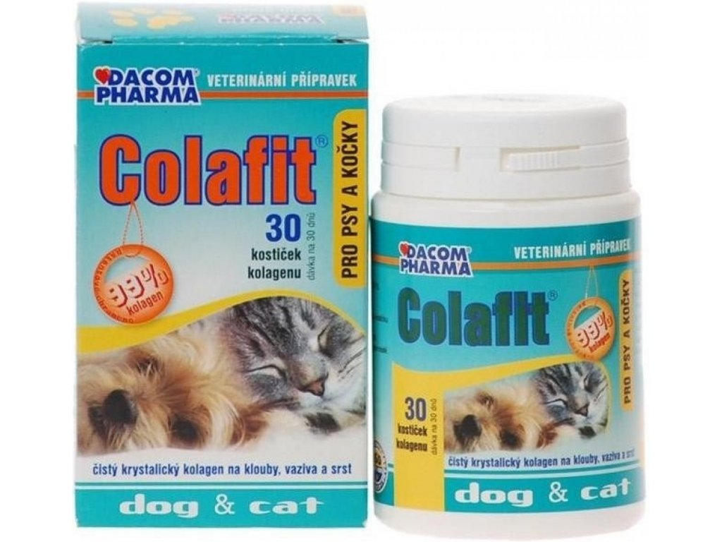 Colafit používáme k: prevenci nedostatku kolagenu v potravě náhradě zvýšené ztráty kolagenu zlepšení stavu srsti pro zvířata v zátěži snížení rizika poruch a postižení pohybového aparátu pro březí a kojící fenky a kočky
