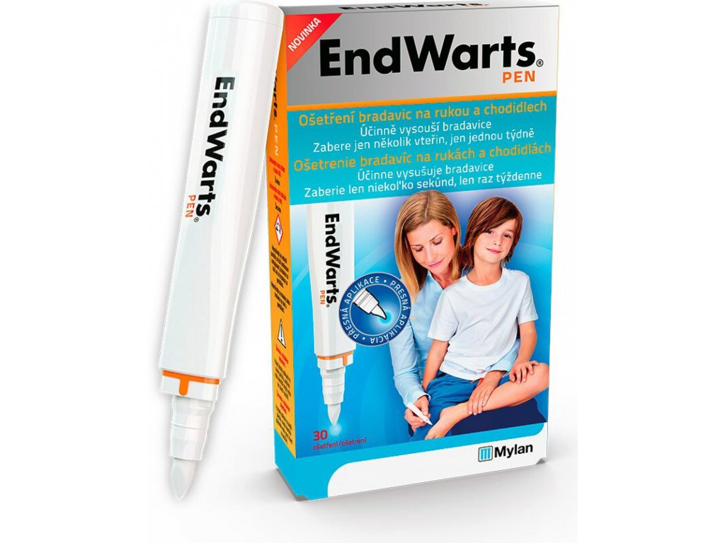 Účinné odstranění bradavic. Přípravek EndWarts PEN je vhodný pro celou rodinu k ošetření bradavic na rukou, nohou, loktech a kolenou. Obsahuje roztok kyseliny mravenčí v praktickém peru, díky němuž je ošetření rychlé a jednoduché. Aplikuje se pouze jedenkrát týdně. Kyselina mravenčí proniká hluboko do bradavice, kterou vysušuje. Pero je určené pro individuální použití, usnadňuje a zrychluje aplikaci roztoku a umožňuje přesné ošetření s nízkým rizikem zasažení zdravé pokožky. Obsah prostředku EndWarts PEN vystačí zhruba na 30 ošetření.