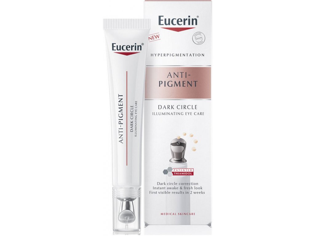 Rozjasňující péče proti tmavým kruhům pod očima Eucerin Anti-Pigment redukuje pigmentové skvrny. Krém rozjasňuje oční okolí a zanechává svěží a mladistvý vzhled. Obsahuje thiamidol, aktivní a patentovanou složku, která se zaměřuje na příčinu hyperpigmentace, neboť snižuje produkci melaninu. Kyselina hyaluronová dokonale hydratuje a vyhlazuje jemné vrásky. Oligopeptidy stimulují produkci kolagenu a tím zvyšují pevnost i pružnost pokožky. Krém se snadno nanáší pomocí chladivého aplikátoru.