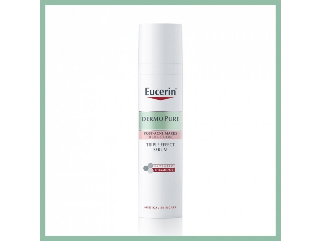Eucerin DermoPure Sérum s trojitým účinkem obsahující patentovaný thiamidol vám umožní konečně zvítězit nad nedokonalostmi pleti a pigmentovými skvrnami po akné díky 3 klíčovým faktorům: