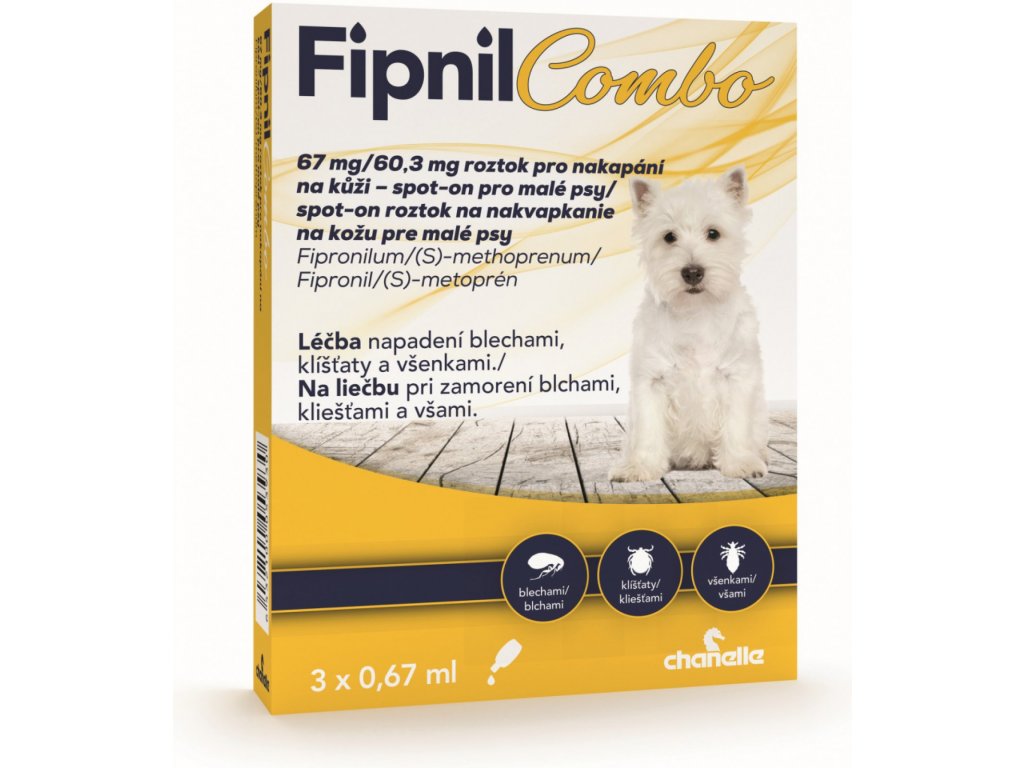 Fipnil Combo 67/60.3 mg roztok pro nakapání na kůži spot-on je určený pro malé psy k použití proti napadení blechami, a to pouze blechami nebo blechami spolu s klíšťaty a/nebo všenkami.