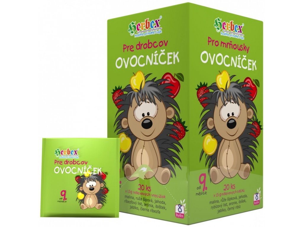 Herbex Ovocníček pro mrňousky je porcovaný čaj pro děti od 9. měsíců. K doplnění pitného režimu v průběhu celého dne.