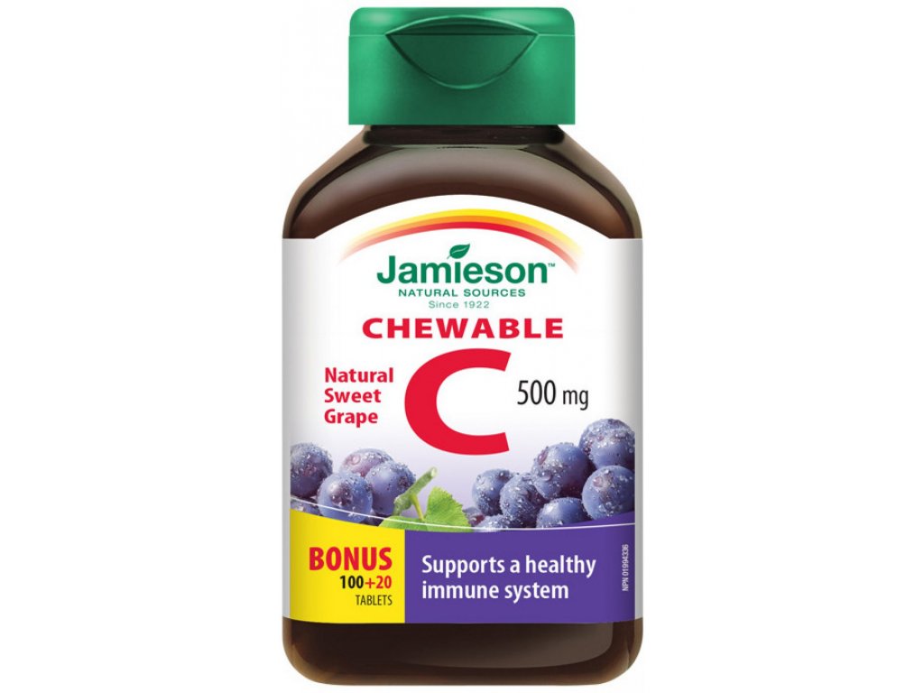 Jamieson Vitamín C 500 mg představuje doplněk stravy ve formě cucavých tablet. Doplněk stravy je s obsahem vysoké dávky vitamínu C. Vhodné k užívání v období fyzické námahy, stresu a v období rekonvalescence. Komfortní užívání cucavých tablet s lahodnou příchutí hroznového vína.