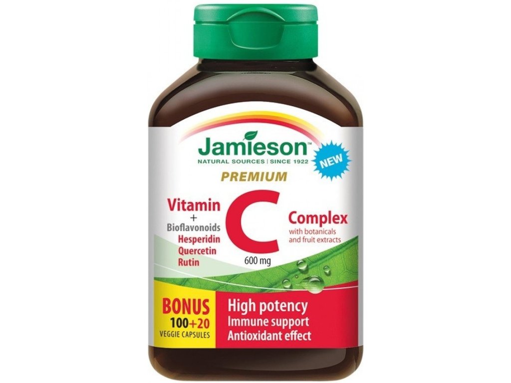 JAMIESON Vitamin C PREMIUM 600 mg s bioflavonoidy je doplněk stravy ve formě vegetariánských kapslí, který obsahuje vitamin C s obsahem bioflavonoidů - rutinu, hesperidinu, kvercetinu a rostlinných výtažků.