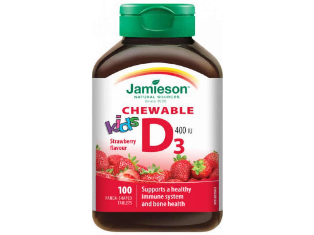 Doplněk stravy Jamieson s vitamínem D3 400 I.U. pro Vaše děti Komfortní užívání cucavých tablet ve tvaru medvídka pandy s lahodnou jahodovou příchutí.