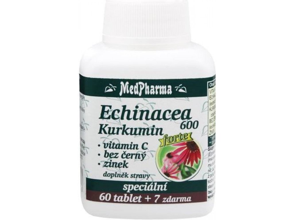 MedPharma Echinacea 600 Forte Kurkumin je doplněk stravy, jehož hlavními složkami je echinacea, vitamin C, bez černý a zinek.