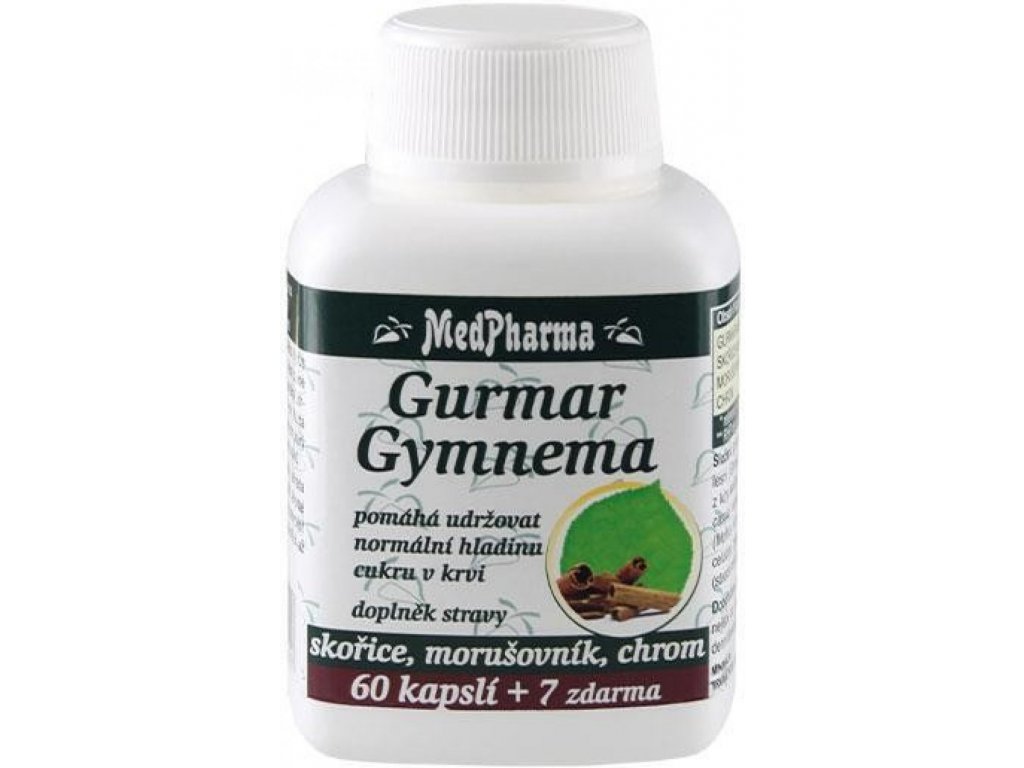 MedPharma Gurmar Gymnema je doplněk stravy ve formě kapslí, který obsahuje extrakty z listů morušovníku bílého (Morus alba) a z listů gymnemy lesní zvané gurmar (Gymnema sylvestre), skořici a chrom.
