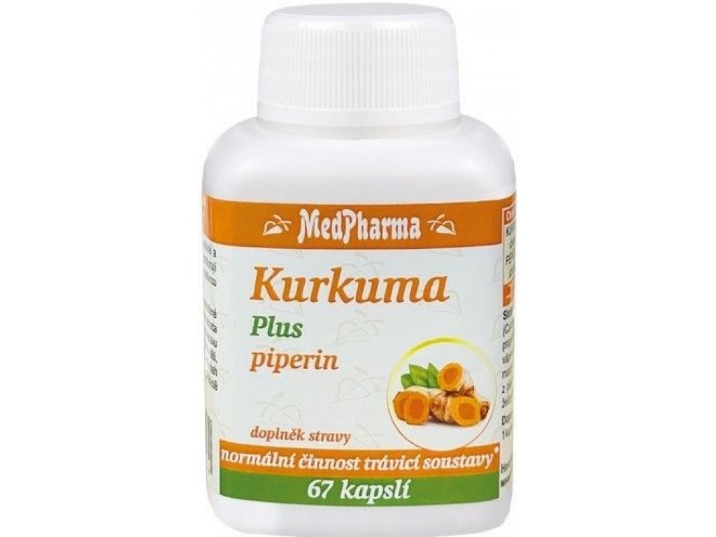 Doplněk stravy Medpharma Kurkuma Plus piperin obsahuje extrakty z oddenku kurkumy dlouhé a z plodů pepřovníku černého, které napomáhají zdravému trávení a mají příznivý vliv na činnost jater. Kurkuma i pepř jsou antioxidanty.