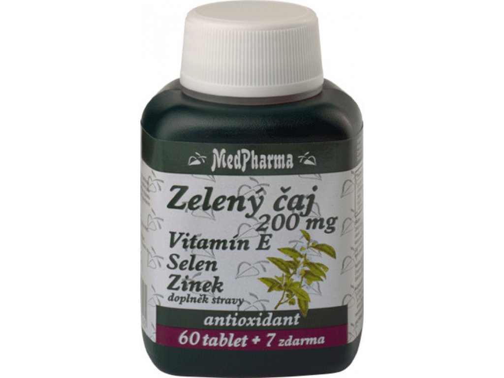 MedPharma Zelený čaj 200 mg Vitamin E Selen Zinek je doplněk stravy ve formě tablet.