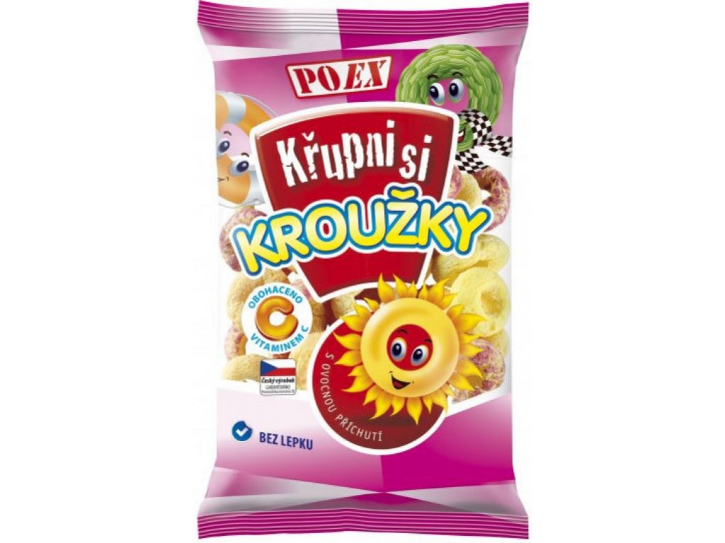 Kroužky s ovocnou příchutí - bez lepku. Extrudované kukuřično-rýžové křupky s ovocnou příchutí, s vitamínem C a vápníkem. Jsou velmi chutné, vhodné pro děti i dospělé.