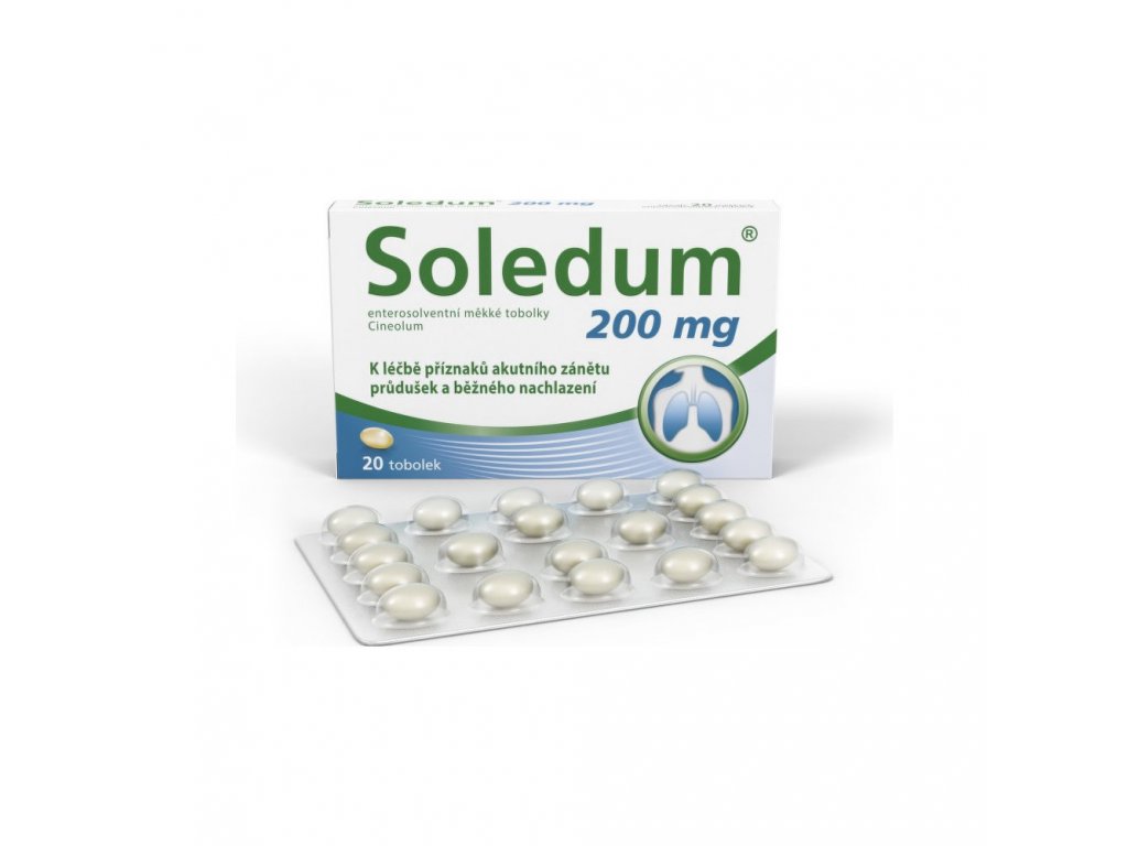 Soledum 200 mg obsahuje léčivou látku cineol, která má protizánětlivý účinek a podporuje vykašlávání. Dále je určen pro dospělé a dospívající (od 12 let) k léčbě příznaků akutní bronchitidy (zánět průdušek) a běžného nachlazení.