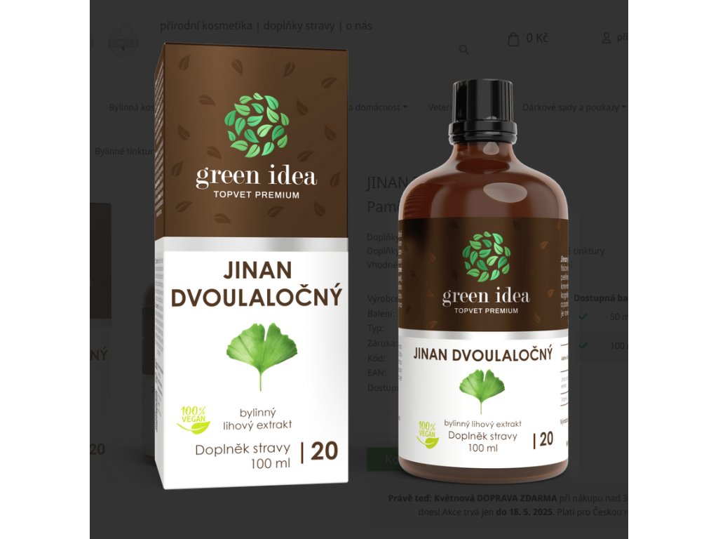Složení: voda, jemný líh (minimálně 35 obj. % alk./ethanolu), Jinan dvoulaločný (Ginkgo biloba) standardizovaný extrakt z listu (20:1), vitamín C (kyselina L-askorbová).
