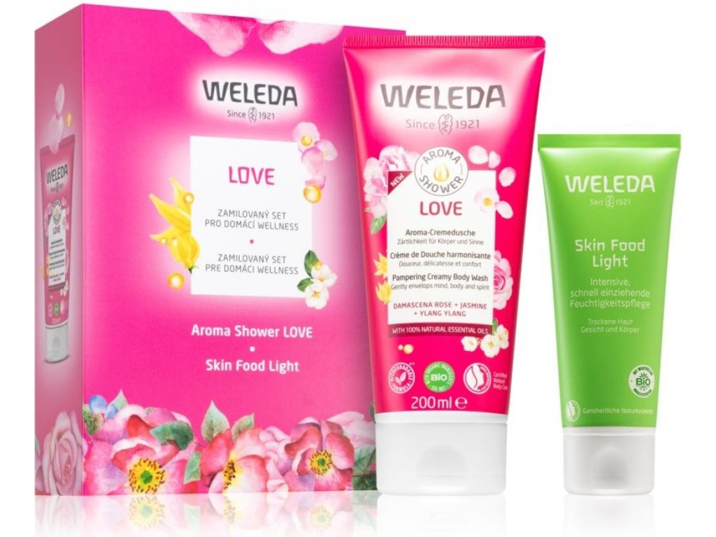 Weleda Aroma set Love obsahuje hydratační krém pro suchou pokožku a sprchový gel, v němž se snoubí čisté přírodní ingredience s vůní vzácných esencí.